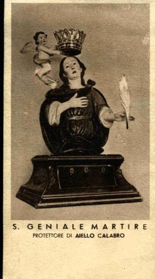 Geniale, quando fu martirizzato, tra il I e il III secolo d.C., ha circa 14 anni. Sepolto nelle Catacombe di San Lorenzo in Roma, vi resterà sino al 4 di maggio del 1653, quando le Reliquie (Ossa e Sangue in una ampolla, conservati ora nel basamento della ottocentesca Statua in legno) vengono estratte per ordine di Papa Alessandro VII e consegnate da Marco Antonio Addo, Cardinale Vicario di Roma, assieme ad altre reliquie di santi, al Cardinale Alderano Cybo, pronipote di quell'Alberico Cybo che fu il primo Marchese di Aiello. In seguito, è il 10 giugno del 1656, le Reliquie di Geniale verranno consegnate dal Cybo a frate Francesco da Pietramala, vice responsabile provinciale per la Calabria dei Minori Osservanti, per essere conservate nel convento aiellese di S. Maria delle Grazie.